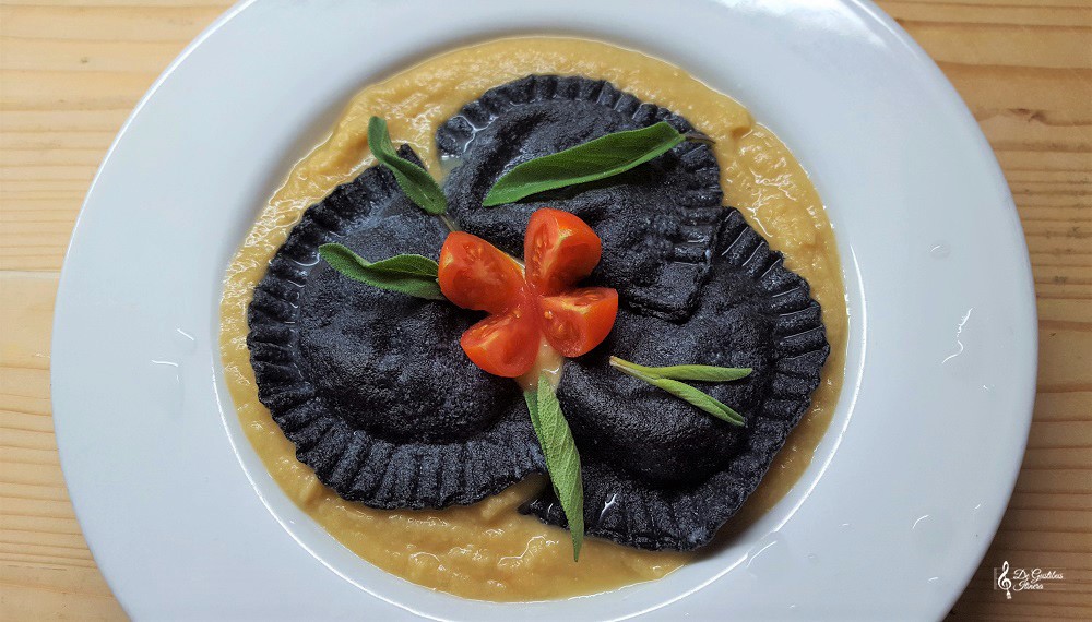 RAVIOLI AL NERO DI SEPPIA CON RIPIENO DI BACCALÀ E PATATE Pubblicato: 11 Agosto 2021 Categoria: PRIMI PIATTI, PIATTI UNICI, MINESTRE Salse, Vegetali, Pesce
